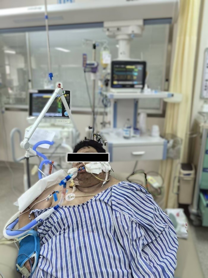 患者在入院前已出现呼吸费力症状,自行来院后症状进一步加剧。急诊团队迅速精准识别其为危重患者,并建议患者应立即入急诊ICU就诊。患者刚进入抢救室,在病床上失去了意识,血氧饱和度更是低至28%,立即予以气管插管,呼吸机辅助通气,初步稳住了生命体征。