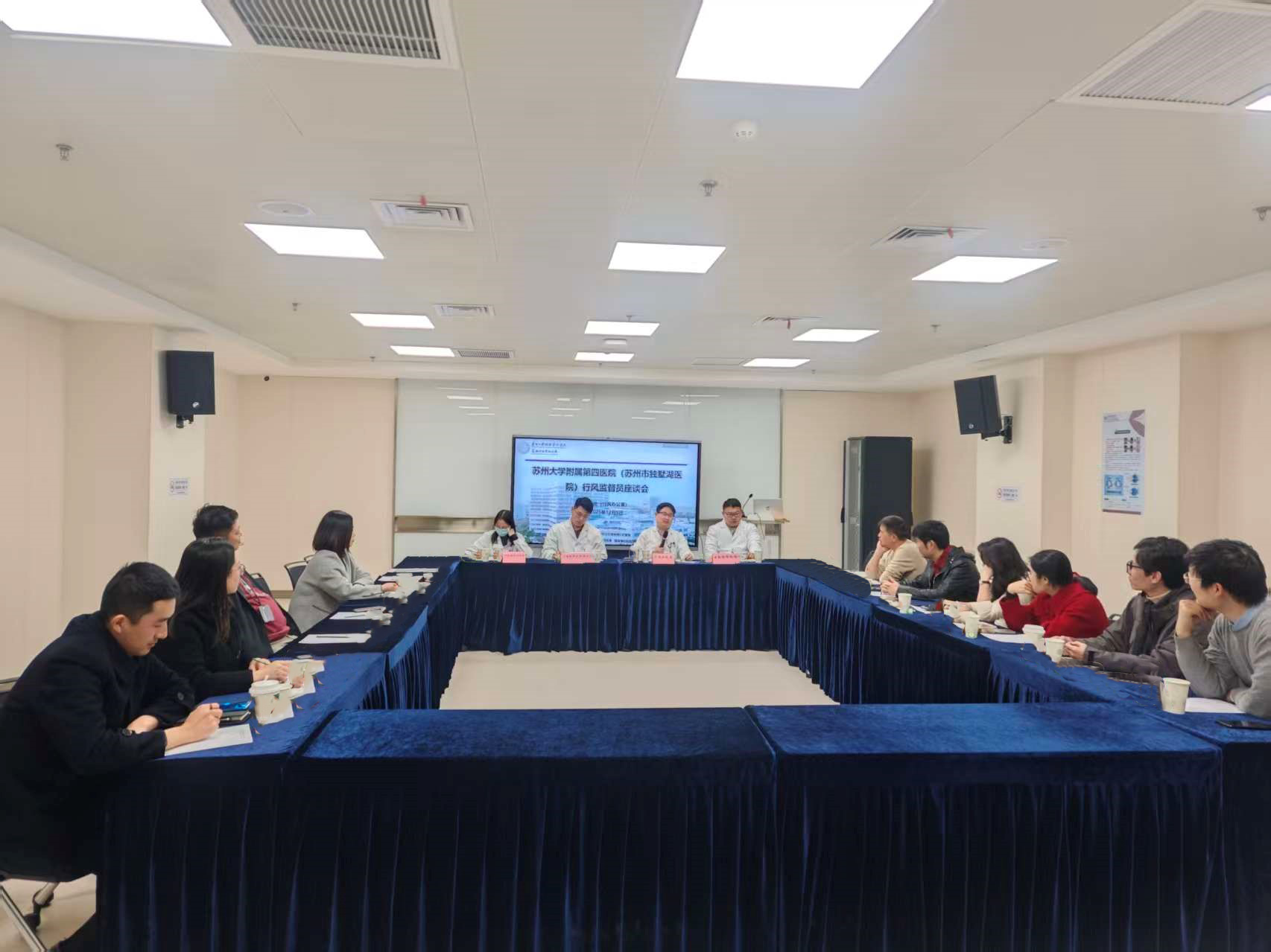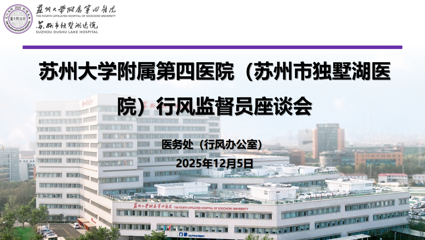 近日,苏州大学附属第四医院举办行风监督座谈会议。多位来自医疗科技、公安、社区服务、教育、金融、制造等领域的行风监督员应邀参加,为提升医院行风建设水平凝聚智慧、贡献良策。会议由医务处(行风办公室)副处长张立峰主持。